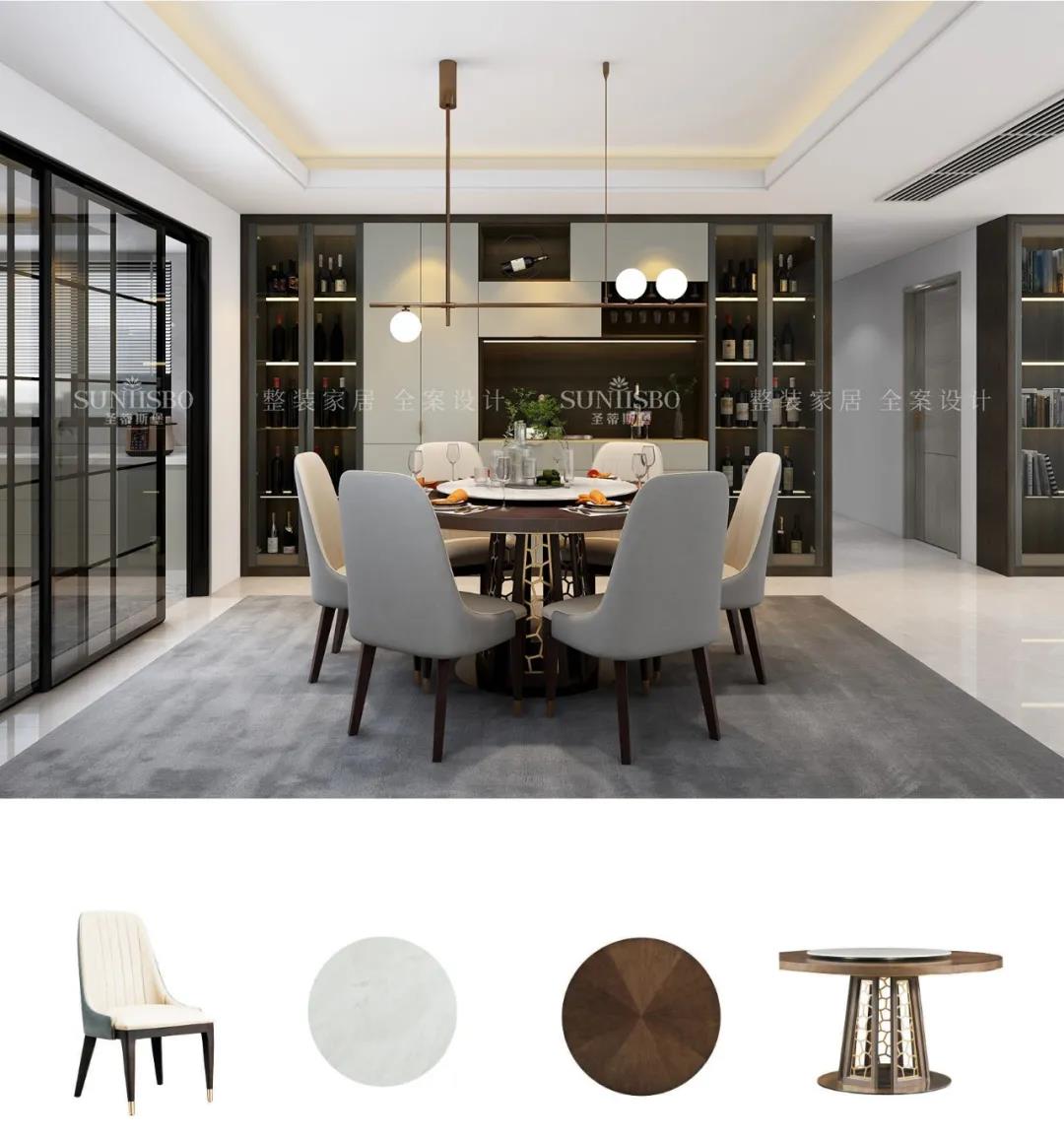 移步到餐廳空間,餐邊柜立面簡(jiǎn)致,紋理細膩,展示區合理分配,增強了空間層次感,彰顯出飽滿(mǎn)的意式美感。實(shí)木柜面加以金屬拉手的裝飾,將極簡(jiǎn)現代與高端質(zhì)感融合,以簡(jiǎn)約的形式表達出“簡(jiǎn)而不失其華”的感染力。