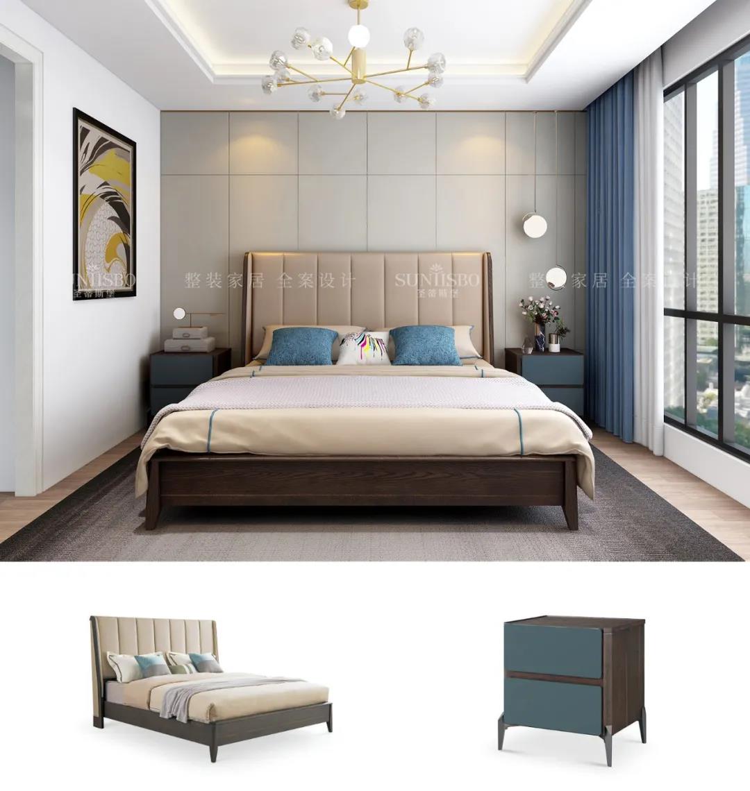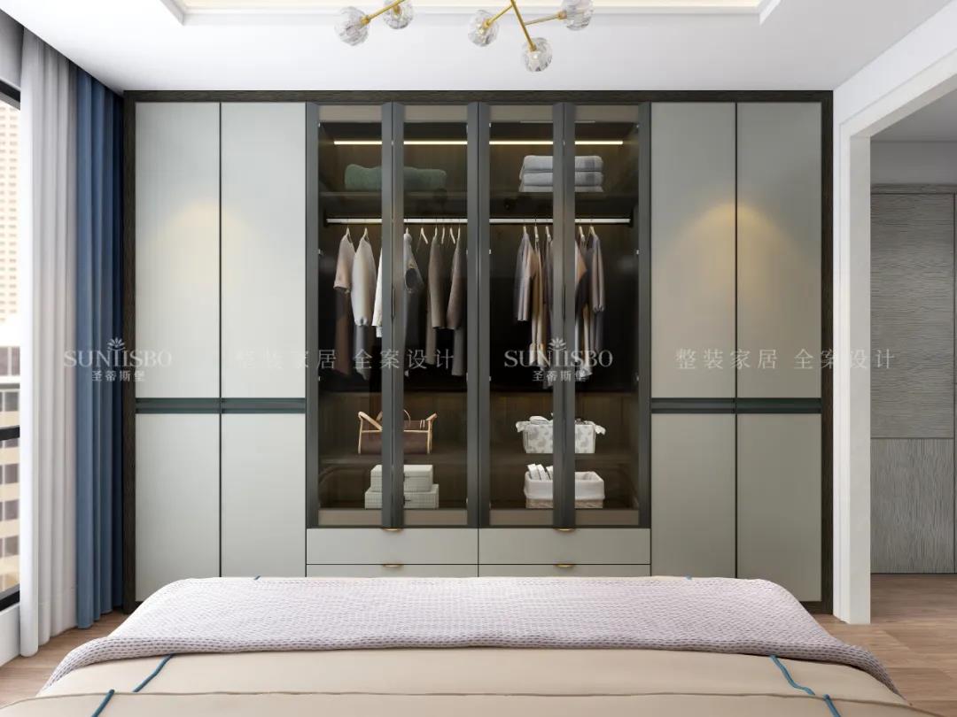 設計師運用最為百搭淺灰實(shí)木護墻板打造主臥空間,簡(jiǎn)約的線(xiàn)條縱橫交錯,帶來(lái)了干凈、清爽、舒適的視覺(jué)效果。明暗分區的衣柜在燈光的渲染下,虛實(shí)光影變換其中,為每個(gè)角落氤氳出浪漫的氣息。